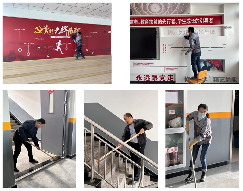 为了贯彻落实学校2023年“三抓三促”行动动员部署会议暨全面从严治党工作会议精神和《关于印发酒泉职业技术学院岁未年初校园安全重大隐患排查整治工作实施方案的通知》精神,2月26日早晨机电工程学院组织全体教师开展抓卫生、促安全、迎接新学期开学准备工作。