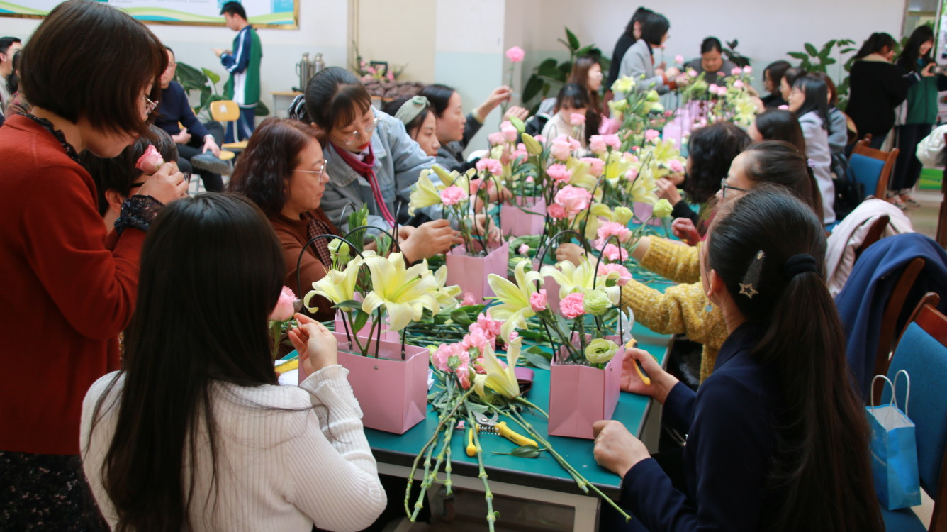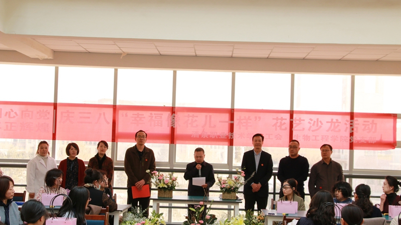 在第111个“三八” 国际劳动妇女节之际,为丰富教职工的精神文化生活,提升教职工艺术修养和生活品味,促进女性身心健康,展现女性热爱生活和积极向上的精神风貌,3月8日,由生物工程学院党支部和学校工会联合举办的“幸福像花儿一样”花艺沙龙在逸夫教学楼三楼大厅隆重举行,来自学校各部门的60余名女教师代表参加了此次活动。 学校党委委员、副校长王立智、学校工会主席刘方及生物工程学院领导班子出席了活动。