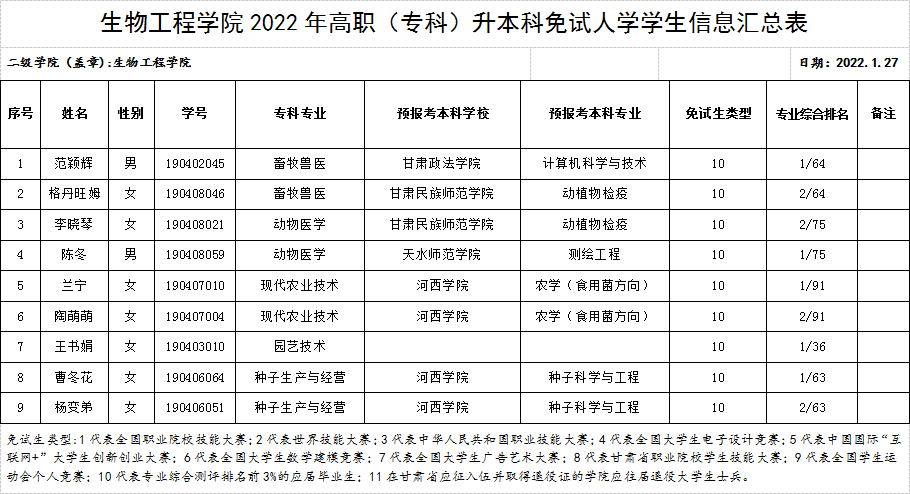 根据《教育部办公厅关于做好2022年普通高等学校专升本考试招生工作的通知》(教学厅〔2021〕8号)和《2022年甘肃省普通高校高职(专科)升本科免试生招生工作实施方案》文件要求,经我院教务办公室审核,范颖辉等9人符合升本科免试招生工作要求,现将名单进行公示。如对公示名单有异议,请在公示期内通过来电来函等形式如实反映。