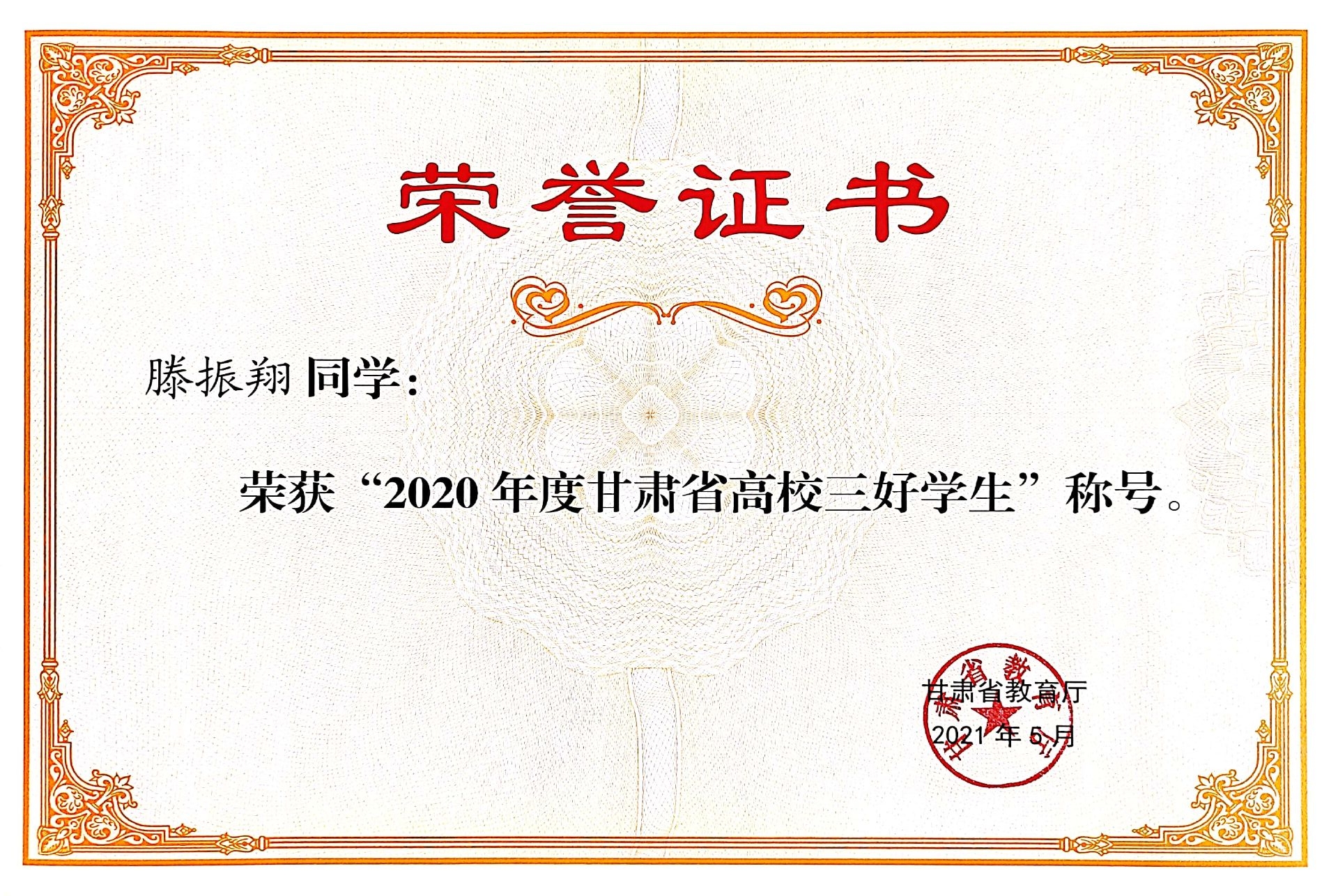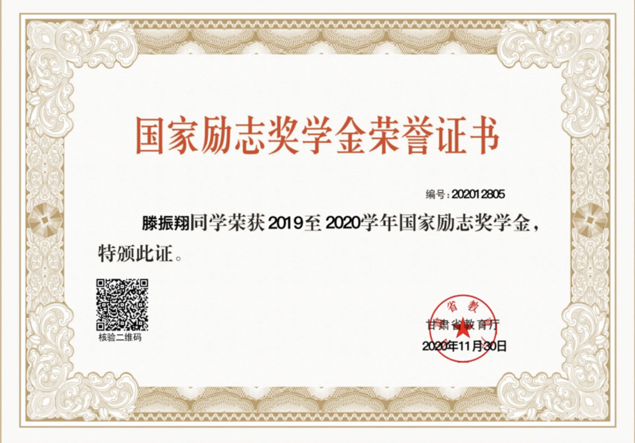 2020年5月荣获甘肃省高校三好学生称号
