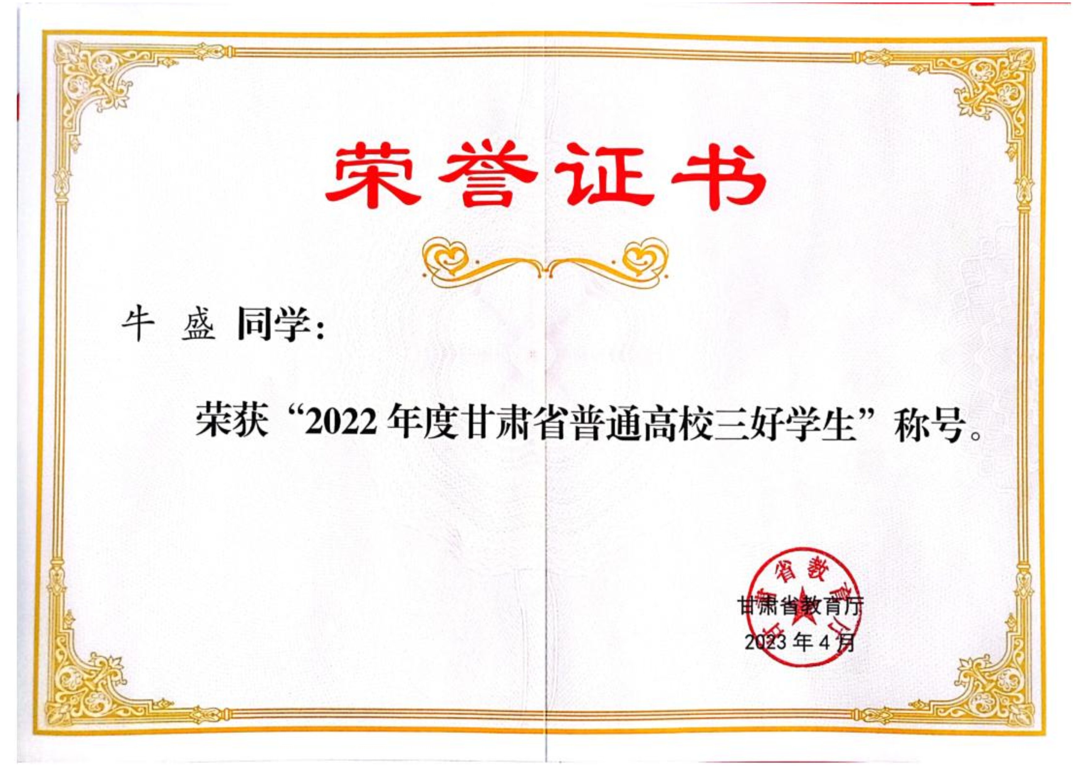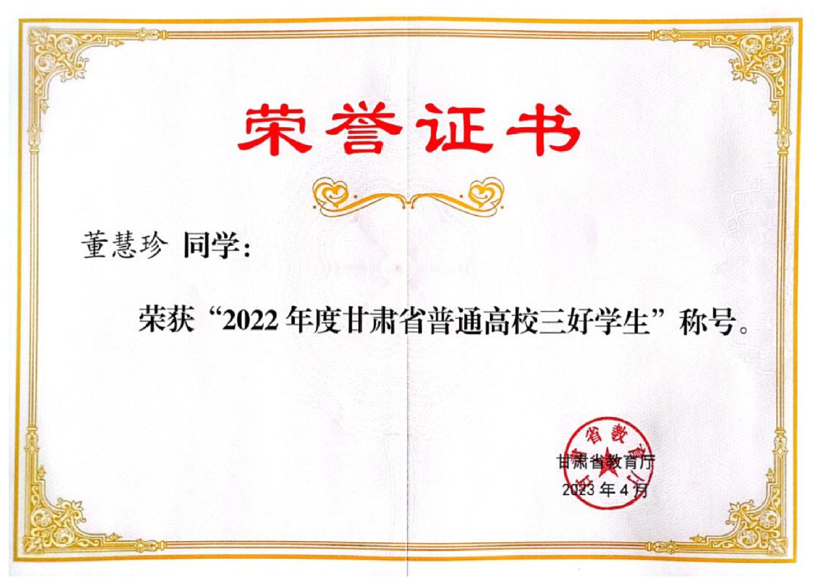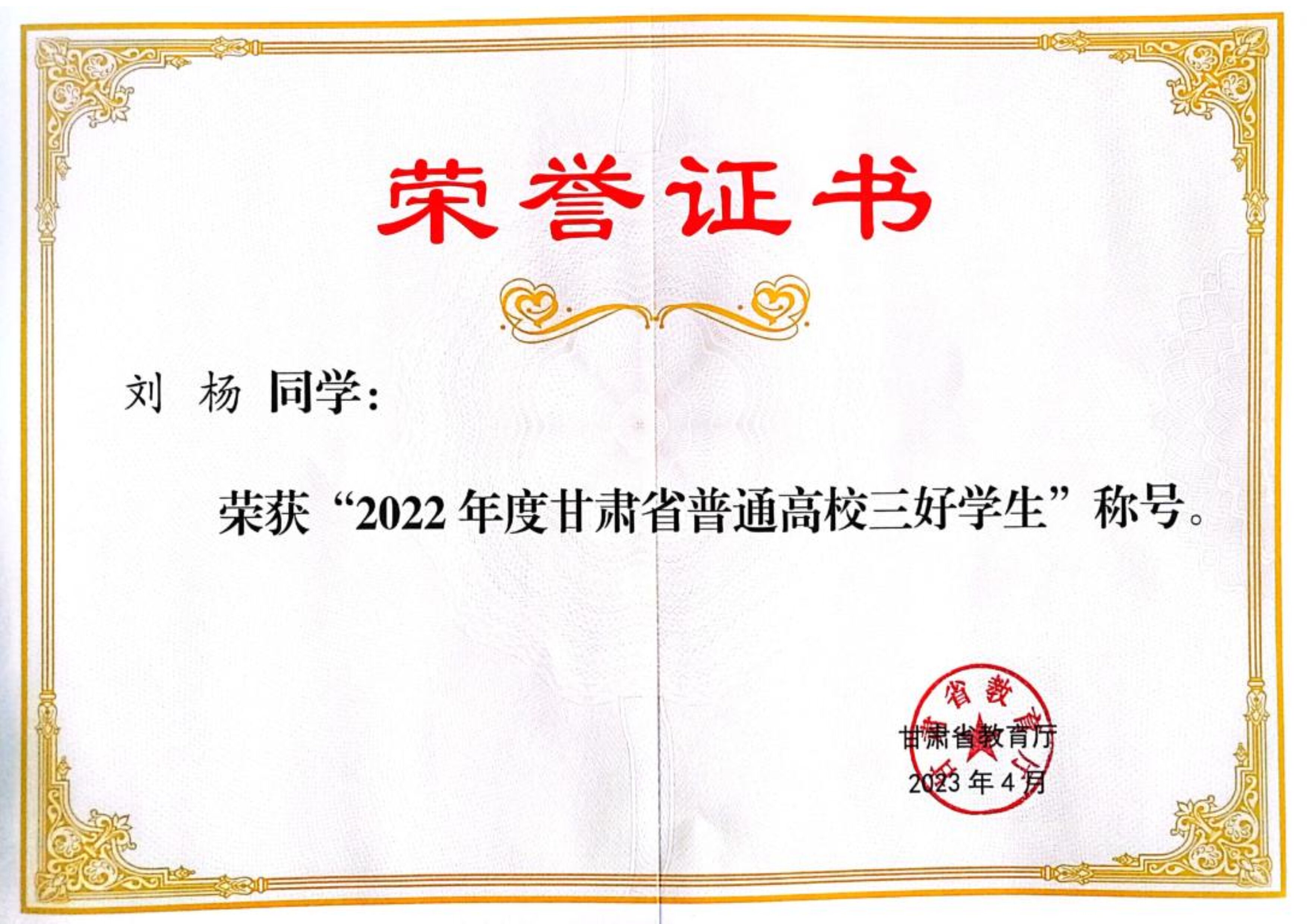 2022年度甘肃省普通高校三好学生