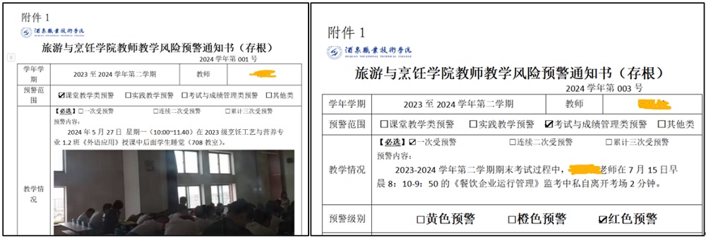 以目标绩效管理为抓手,以提升育人成效和管理提质增效为目标建立预警机制,从督导“问责”向“增效”转变。制定《旅游与烹饪学院教师教学风险预警办法》《旅游与烹饪学院学业预警管理办法》对督导中发现的问题实施常态性、周期性、专题性预警。促进浅表问题即时改,复杂问题持续改。提高了教师关注教学的责任,感调动教师了改进的积极性,同时鼓励学生学业质量整体提高。