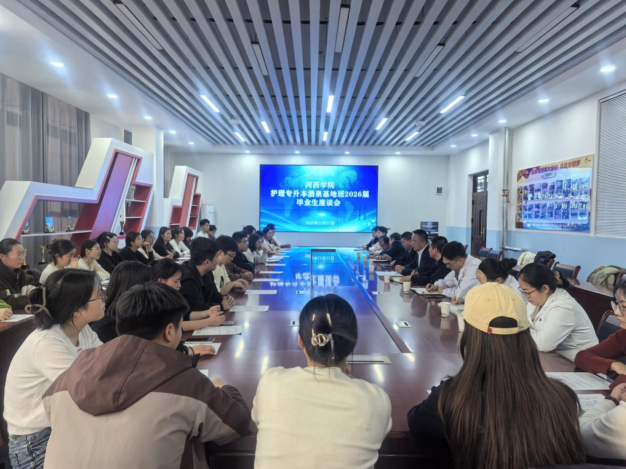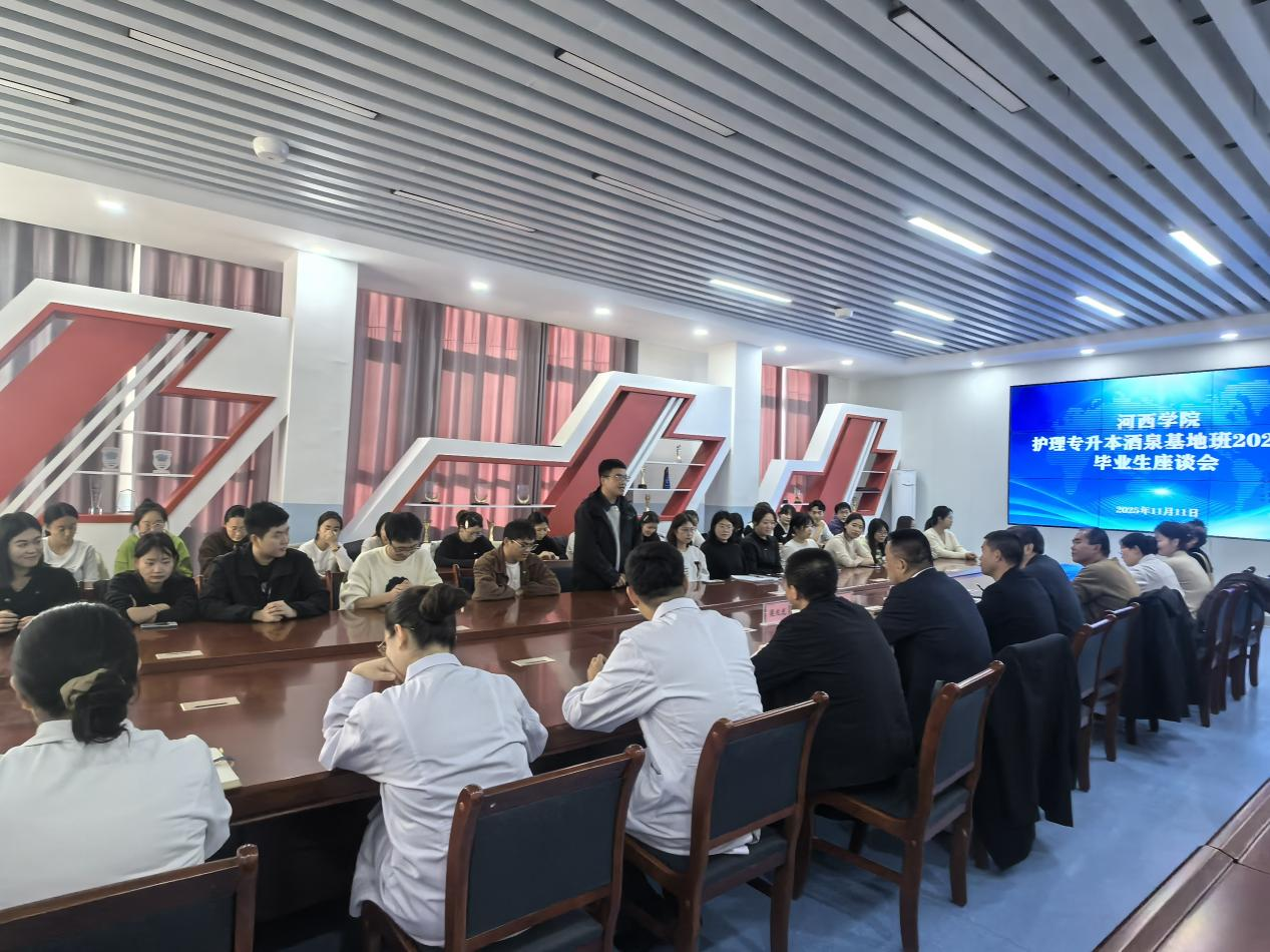 2025年11月11日下午,河西学院党委书记梁兆光率办公室主任朱睦正、教务处处长杨彬、护理学院党委书记沈承明一行来到医学院,就24护理学“专升本”班学生的学习生活、实习安排及就业发展等议题开展专题座谈。医学院副院长于荣哉、孙孟妍以及各教研室主任共同参与座谈,师生代表到场交流。