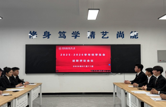 为深入学习贯彻习近平新时代中国特色社会主义思想,全面落实共青团中央、全国学联关于深化高校学生会组织改革的有关要求,进一步规范和加强学生会工作人员述职评议制度,根据《普通高等学校学生会(研究生会)章程制定办法》《普通高等学校学生(研究生)代表大会工作规定》及学校相关制度,学校学生会于2026年1月11日组织召开2025-2026学年述职评议工作会议。校团委负责同志、校学生会秘书长、校院两级学生会组织主席团成员、工作部门负责人及学生代表共40余人参加会议。