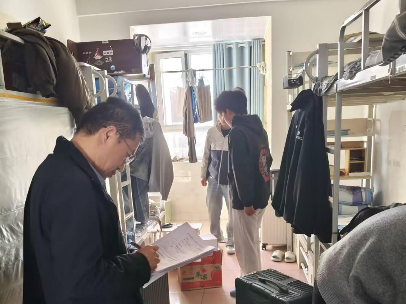 各班主任到学生宿舍开展安全、卫生专项检查,要求学生离校前务必切断所有电源、关闭水源,妥善保管贵重物品,锁好门窗,同时,整理好个人物品,保持宿舍整洁有序。
