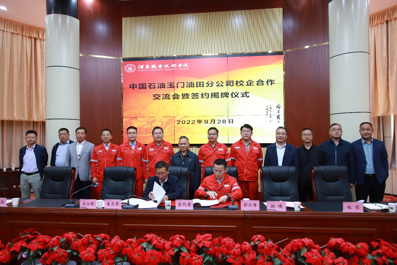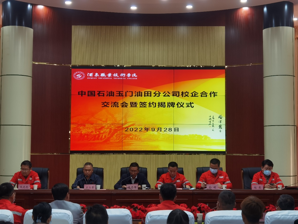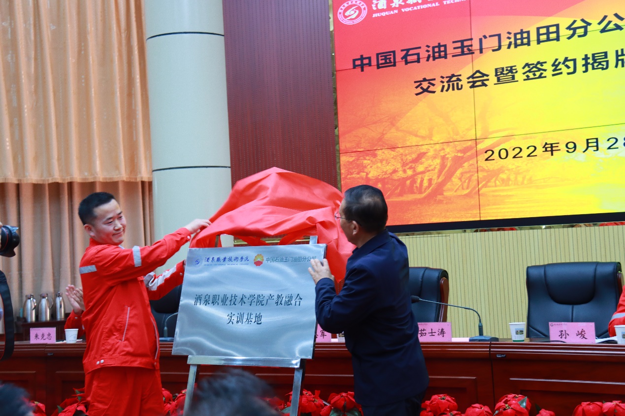 双方签署了校企合作协议,并为“酒泉职业技术学院产教融合实训基地”、“玉门油田分公司继续教育基地”揭牌。