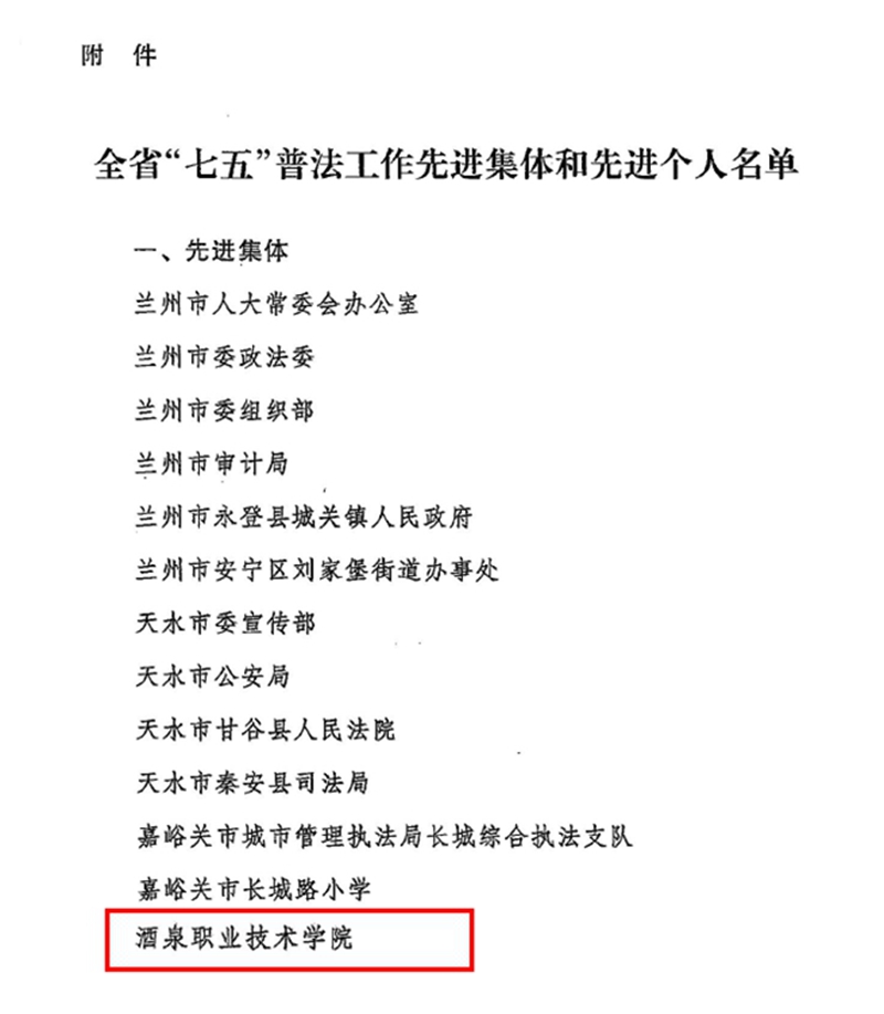 今年,中共甘肃省委宣传部、甘肃省人力资源和社会保障厅、甘肃省司法厅联合开展了全省“七五”普法工作先进集体和先进个人评选工作,经逐级审核推荐、评选公示,酒泉职业技术学院被评为“全省'七五'普法工作先进集体“称号,是全省唯一获此殊荣的高职院校。