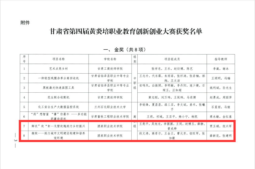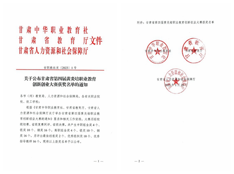 近日,由甘肃中华职业教育社、甘肃省教育厅和甘肃省人社厅主办的甘肃省第四届黄炎培职业教育创新创业大赛获奖名单公布,我校荣获金奖2项、银奖2项。金奖项目将代表甘肃省参加全国第六届黄炎培职业教育创新创业大赛。此外,本届大赛学校还获得优秀组织奖。