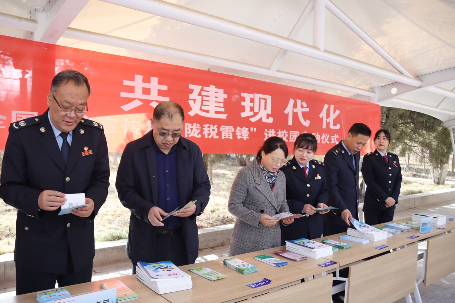 酒泉市税务局向学校捐赠图书,并向大学生税法宣传志愿服务队授旗。