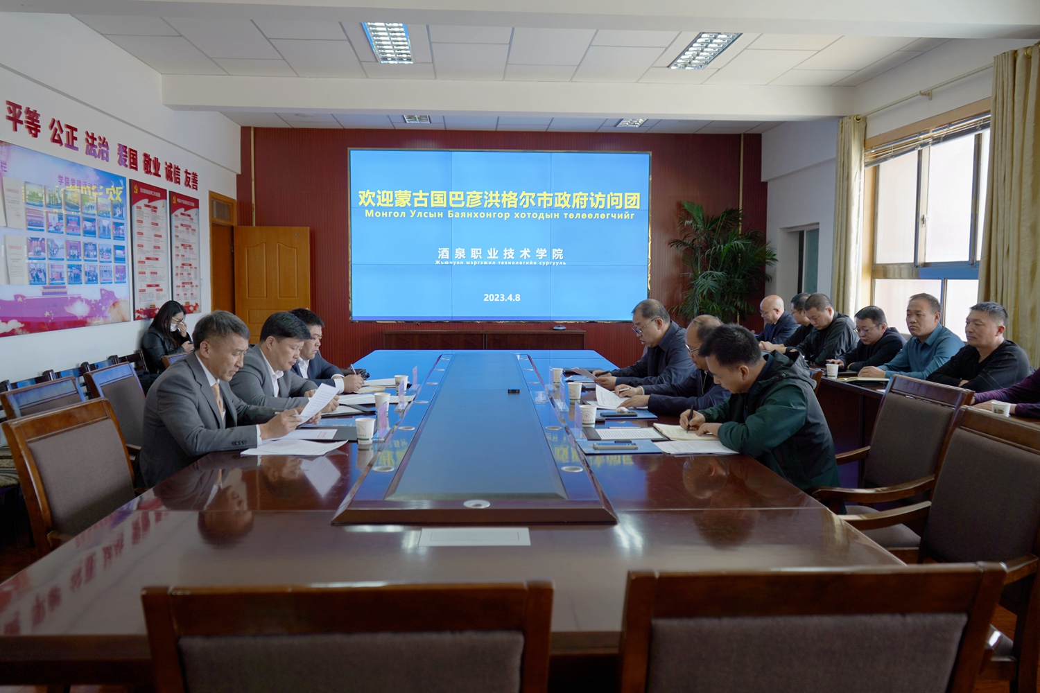 要闻快递 > 正文4月8日,蒙古国巴彦洪格尔市市长嘎·恩赫巴雅尔、蒙古国巴彦洪格尔省食品与农业局局长乌·巴拉津尼玛带领相关人员来我校考察交流。酒泉市外事办主任曹广成、副主任刘万文等相关领导出席座谈会。酒泉职业技术学院党委副书记许军、党委委员、副校长施荣参加会议。