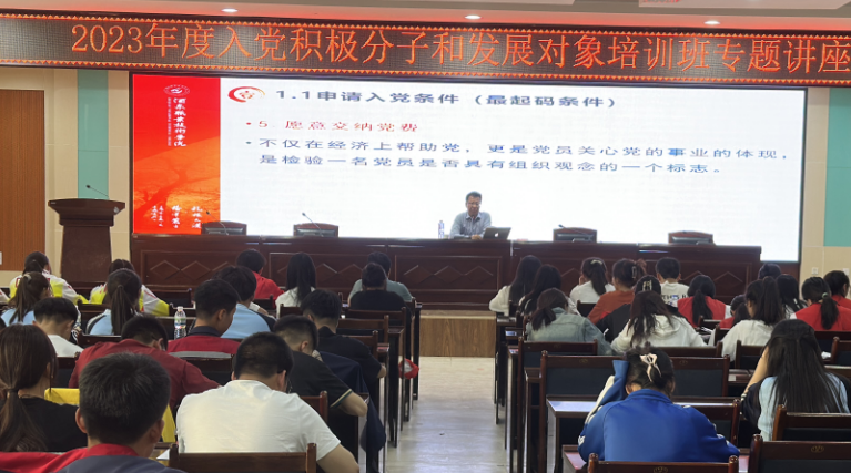 王金明从中国共产党发展党员工作流程、谁可以申请加入中国共产党、入党需要什么程序展开讲解,并以案例为切入点,讲解入党动机是什么?大学生入党动机不正确的主要表现,引导教育学员应该“家事国事天下事,事事关心”,积极学习党史、党的方针政策、党的行动纲领,践行党的理论。最后王金明要求学员对照党章找差距,全面了解党章对党员的标准,了解党员的义务和权利,不断提高思想认识,端正入党动机,并以实际行动体现自己积极要求加入党组织的信心,争取早日入党。