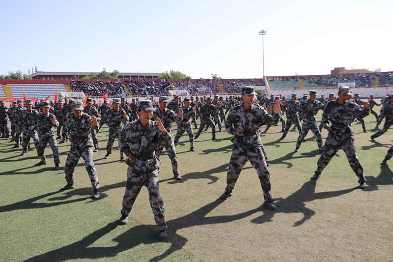 12个军训营代表方阵按照抽签顺序依次展示单个军人队列动作,同学们个个军姿挺拔、精神饱满,充分展示了意气风发、昂扬向上的精神风貌,诠释了扎根大漠,荫泽苍生的胡杨精神。会操结束后,匕首操、擒敌拳、盾棍术及国防教育学院学员代表进行班(排)技战术展示,逐一上场亮相,同学们眼神坚定,防守攻击,一招一式,尽显干练风范,刺、闪、挥、劈、挡,招招凌厉;拳打、脚踢、摔打,出拳有力而坚定,踢腿快速而凌厉,生动诠释着踔厉奋发的昂扬姿态。会操结束后,千人团体操表演将现场气氛推向高潮。