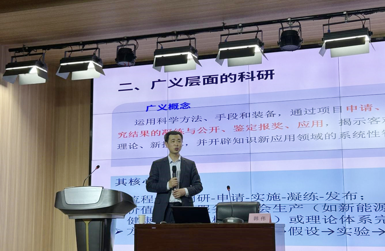 韩伟教授从科研的概念、科研选题与方向确立、科研项目申请与项目实施科研论文写作、学术投稿与优化策略五个方面进行详细的讲解,参会教师就科研选题和团队建设进行了交流讨论。