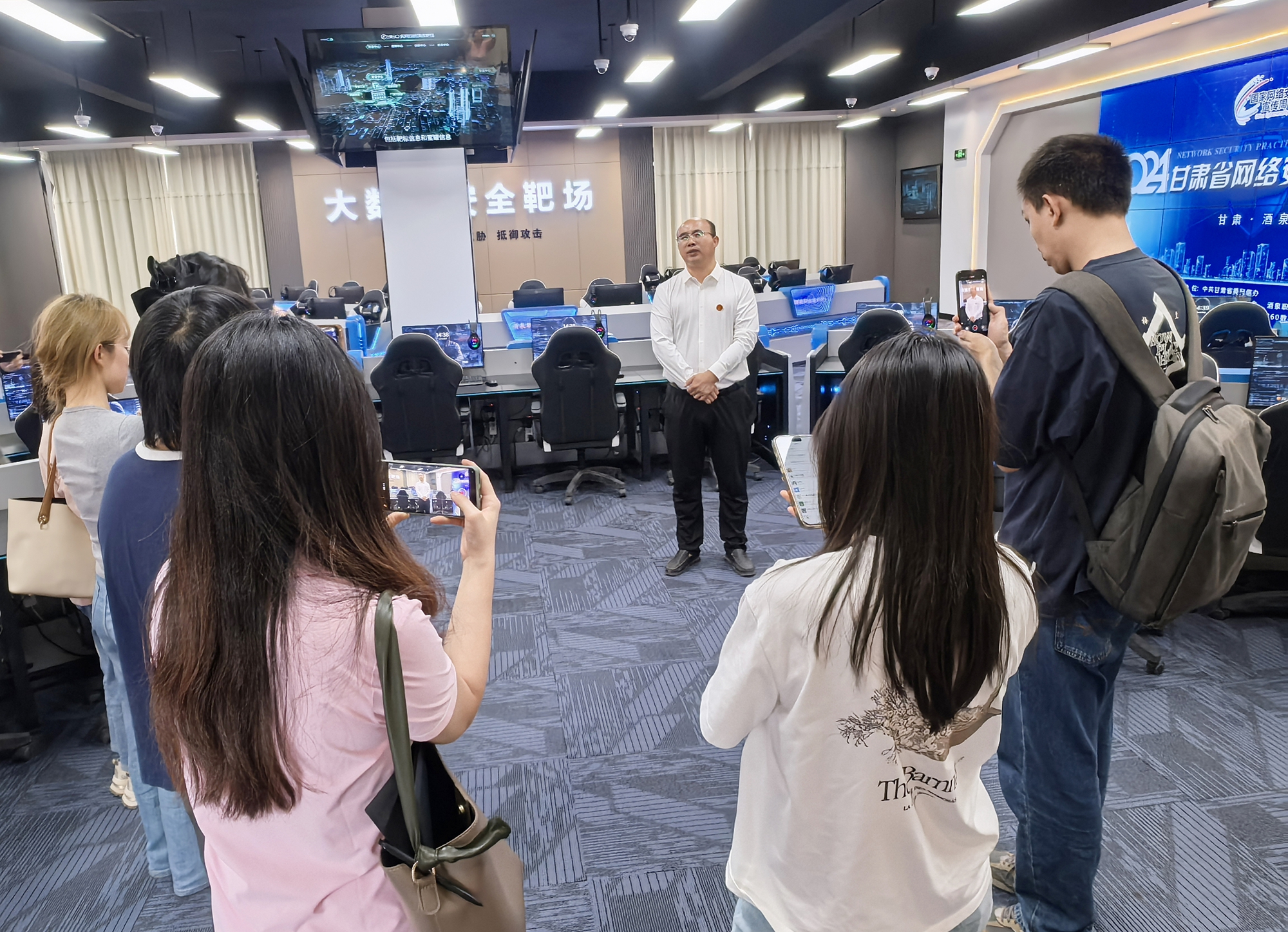 参观结束后,采访团对副校长杨洁进行了现场专访,杨洁系统介绍了学校在网络安全领域的建设理念、实践路径与发展规划。他表示,学校把握时代脉搏,整合优势资源成立电子与信息工程学院,先后开设了人工智能、信息安全、物联网等前沿专业,形成信息技术专业群,打造了高度仿真的网络攻防演练环境“大数据安全靶场”,并与国内网络安全企业360建立深度合作关系,共建360数字安全产业学院,共建课程、共编教材、共研项目,又与兰州大学三家牵头成立了全国人工智能+安全(数字安全)产教融合共同体。今后,学校将持续深化内涵建设,不断更新课程内容,引进和培养高水平师资,升级优化靶场平台,保持技术前沿性,与更多企业、科研机构、政府部门建立紧密合作,共同探索应对复杂多变的安全挑战策略,为培养堪当大任的网安尖兵、护航数字中国建设贡献坚实的‘酒泉力量’!