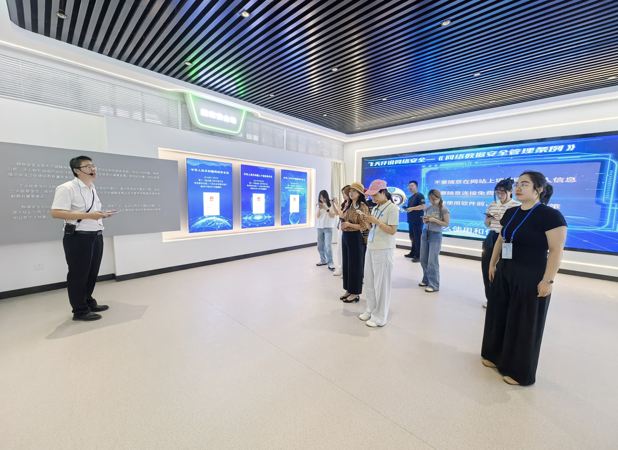 采访团一行实地考察了数字安全科普素养基地、大数据安全靶场及国家安全教育基地等场所,详细了解了学校网络安全人才培养模式、课程体系建设和科研技术创新等方面的特色举措与实践成果。在大数据安全靶场,观看了仿真攻击防御演练系统,了解了“攻防实训平台”运行机制。深入国家安全教育基地,通过图文展板、互动投影等形式,直观感受到学校将国家安全教育融入人才培养全链条的创新实践。